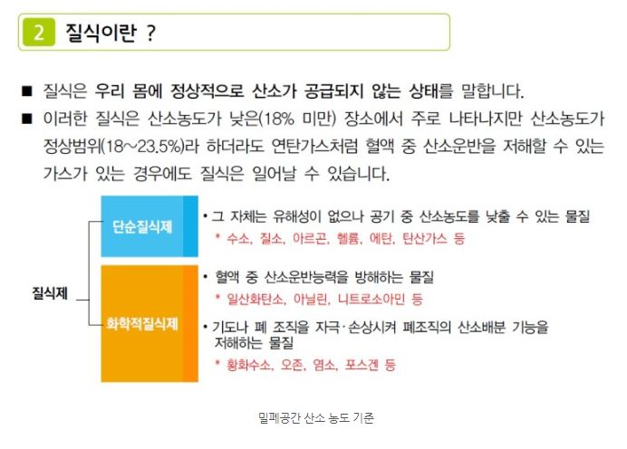 적절한 환기가 되지 않은 상황에서 산소 농도 저하 및 독성가스가 기준치 이상으로 올라갈 경우