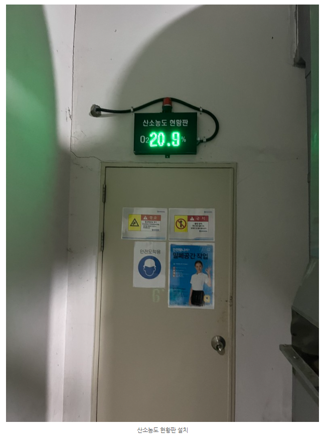 산소 농도 현황판은 경광등이 장착된 구성으로, 산소 농도 18.5 이하 / 23% 이상으로 측정될 경우