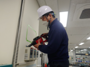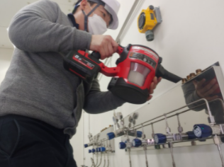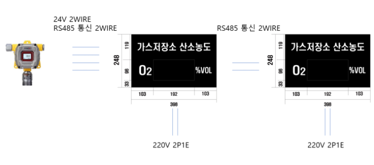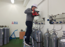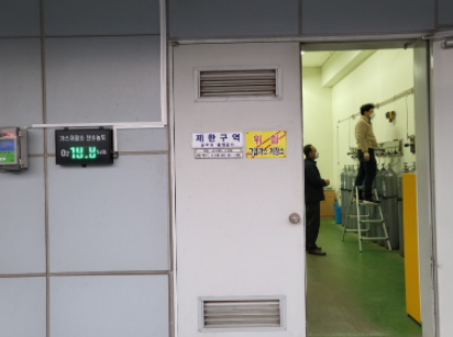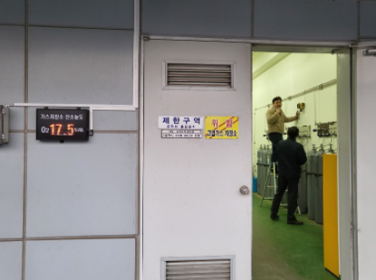 담당자분을 자리에 모셔 제품 교육과 시연을 진행하였습니다. 교정 가스 주입시 제품의 산소 농도가 떨어지며 전광판의 수치가 변경되는 것을 확인 할 수 있습니다.