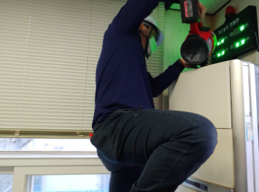 리모콘을 이용하여 제품을 조작하고 전광판 쪽에 배치된 직원과 통화를 하면서 동작테스트를 진행합니다.