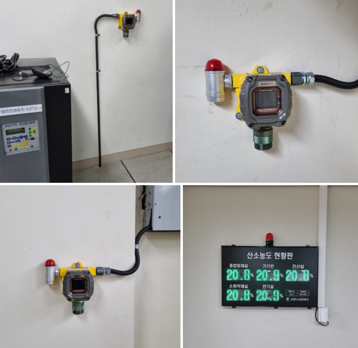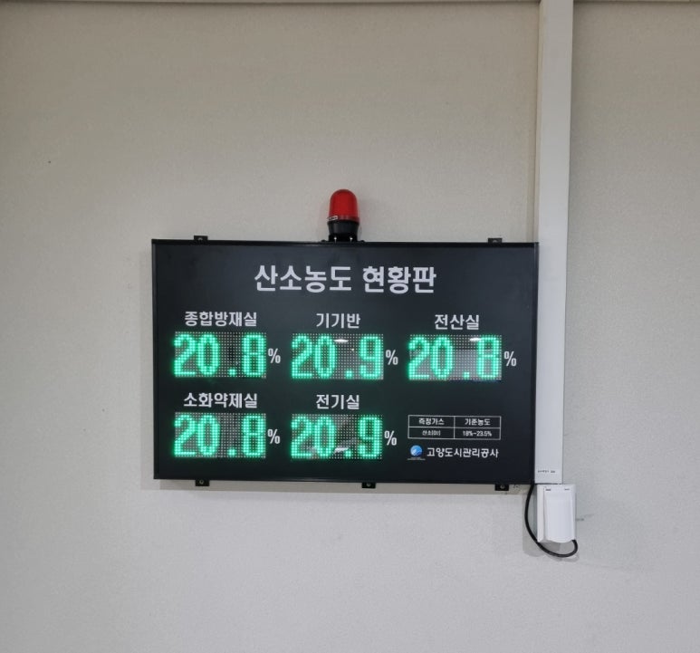 체육관과 마찬가지로 종합운동장 종합방재센터 내의 질식사고가 우려되는 현장인 방재실,기기반,전산실,전기실, 소화약제실에 산소농도 측정기 FIX800, 전광판 설치를 진행중입니다.