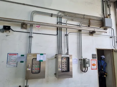 6. 미리 포설된 220V 전원선과 4-20ma 신호선을 결선합니다. 아쉽게도 전기 시설팀과의 일정이 맞지 않아