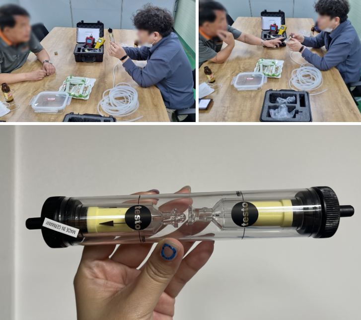 돈축사, 도축장 도개장 분뇨는 수분이 다량 포함되어있어 수분필터를 사용하여 수분을 걸러낸 후 측정해야합니다.
