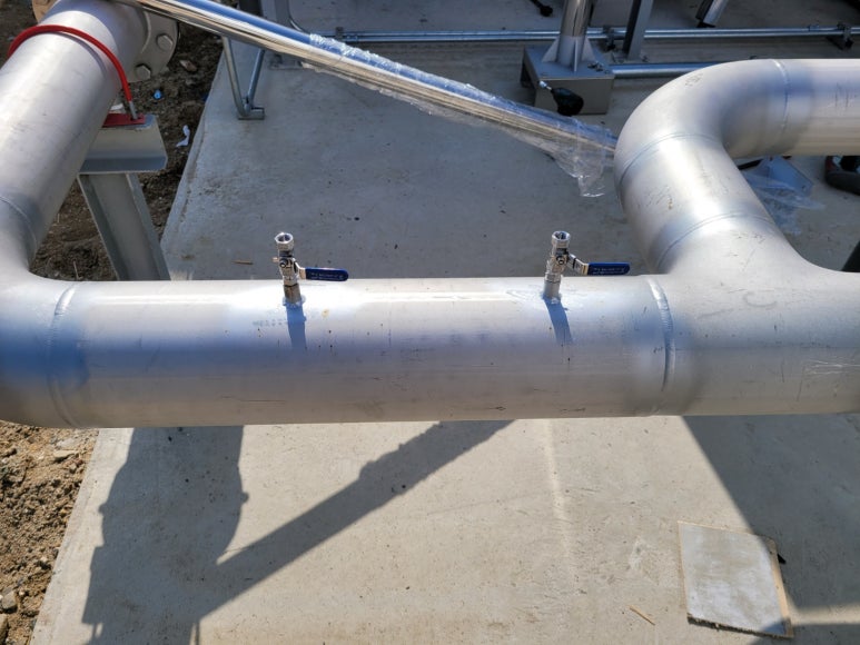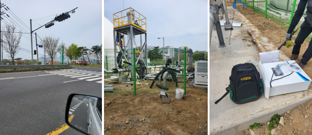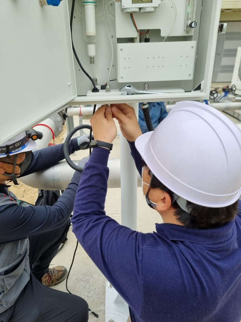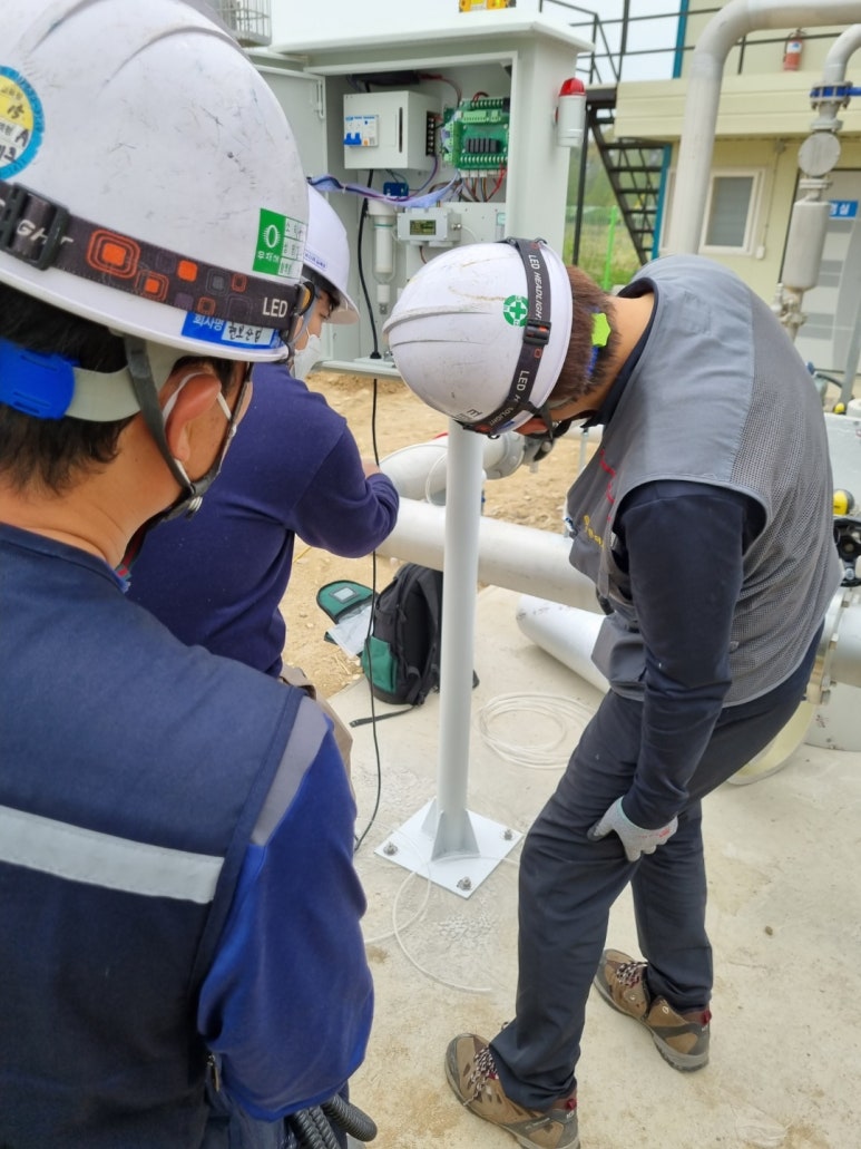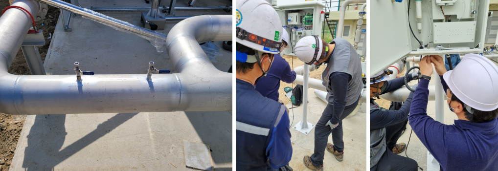 We requested the company in advance to create a service port in the gas pipe. A ball valve type fitting is connected in preparation for when not in use. One side is used for gas intake and the other side is used for gas exhaust. After doing anchor work, setting up the pole and fixing the product, we connected the measuring device and gas pipe with a sampling line. We even went so far as to work on protection pipes to protect the hoses from strong winds or other variables.