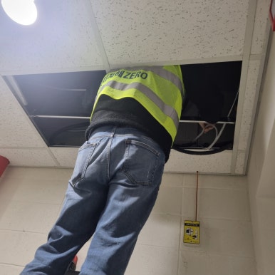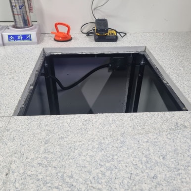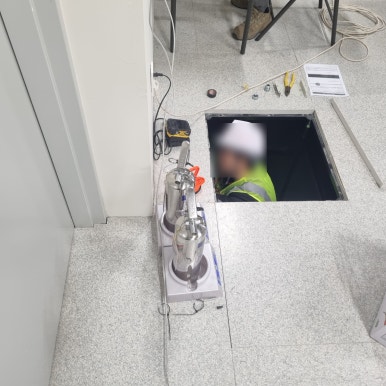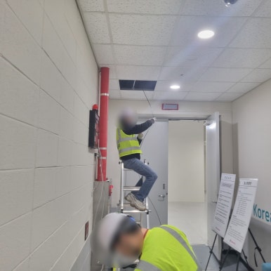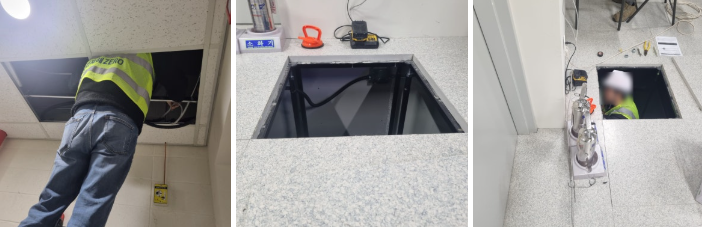 The location of the electronic signboard is being installed in a place where the site manager looks here and there and makes a decision. The same as the measuring instrument, it is installed in a location that is easily visible and at a height within reach for after-sales service maintenance. After completing the installation of the electronic signboard, the measuring instrument was installed. In response to a request to connect the power and communication lines using the wiring box on the ceiling and floor without drilling into the wall, the work was carried out by opening the ceiling and floor.