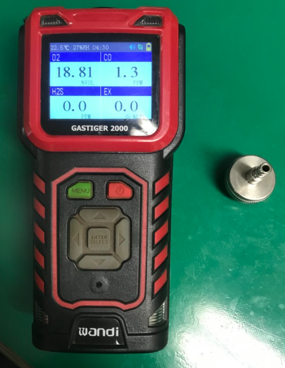 Oxygen read slightly below the 20.9% ambient reference, while CO flickered near 1 ppm before returning to zero—signs the unit needed a proper span check.